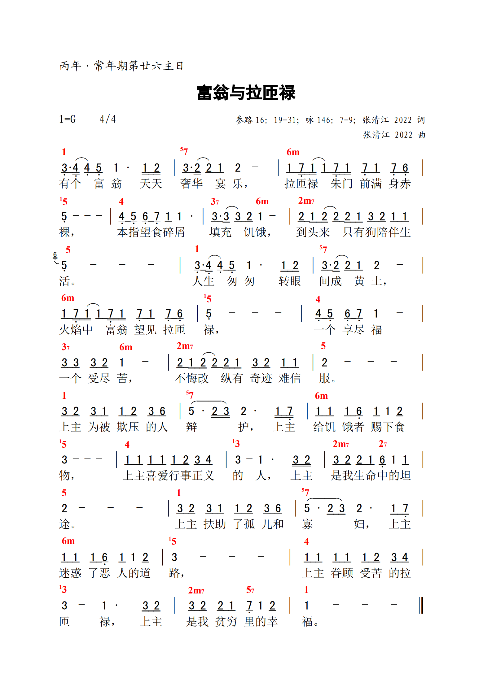 主日赞歌|《富翁与拉匝禄》丙年常年期第二十六主日 发布日期:2025-09-26 | 作者:仆仁文化 词/曲:张清江 编 曲:谭 艺 演 唱:谭 艺 发 行:真理文化 富翁与拉匝禄—丙/常年期26主日专辑:主日赞歌(丙年)作者:仆仁音乐 【歌谱】
