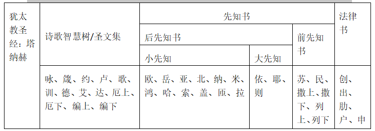 犹太教圣经常被称为“塔纳赫”(Tanakh)。这个词是犹太教圣经三部分名称首字母组成的缩写:托拉(Torah,即“法律书”)、先知书(Nevi’im)和圣文集(诗歌智慧书Ketuvim)(路24:44)。法律书对应梅瑟五书。先知书分为“前先知书”和“后先知书”,前先知书包括从《若苏厄书》到《列王纪下》的历史书,后先知书包括从《依撒依亚先知书》到《玛拉基亚先知书》的典籍。圣文集则包含所有不属于前两类的其他典籍。
