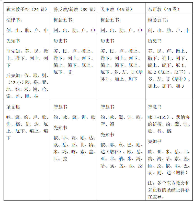 犹太教、天主教、新教和东正教团体在旧约典籍的顺序和分类上各有不同传统。