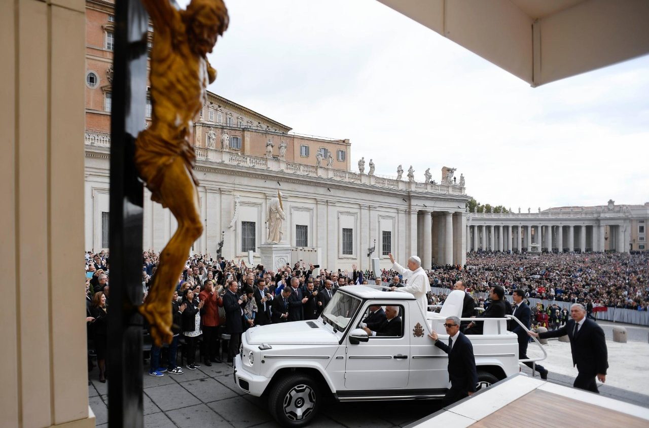 当天罗马的天气就如同前往厄玛乌的两位沮丧门徒的心情一样见不到太阳,而且下了场小雨。挤满圣伯多禄广场的朝圣者在聆听教宗的谆谆教诲时,撑起了五颜六色的雨伞。
