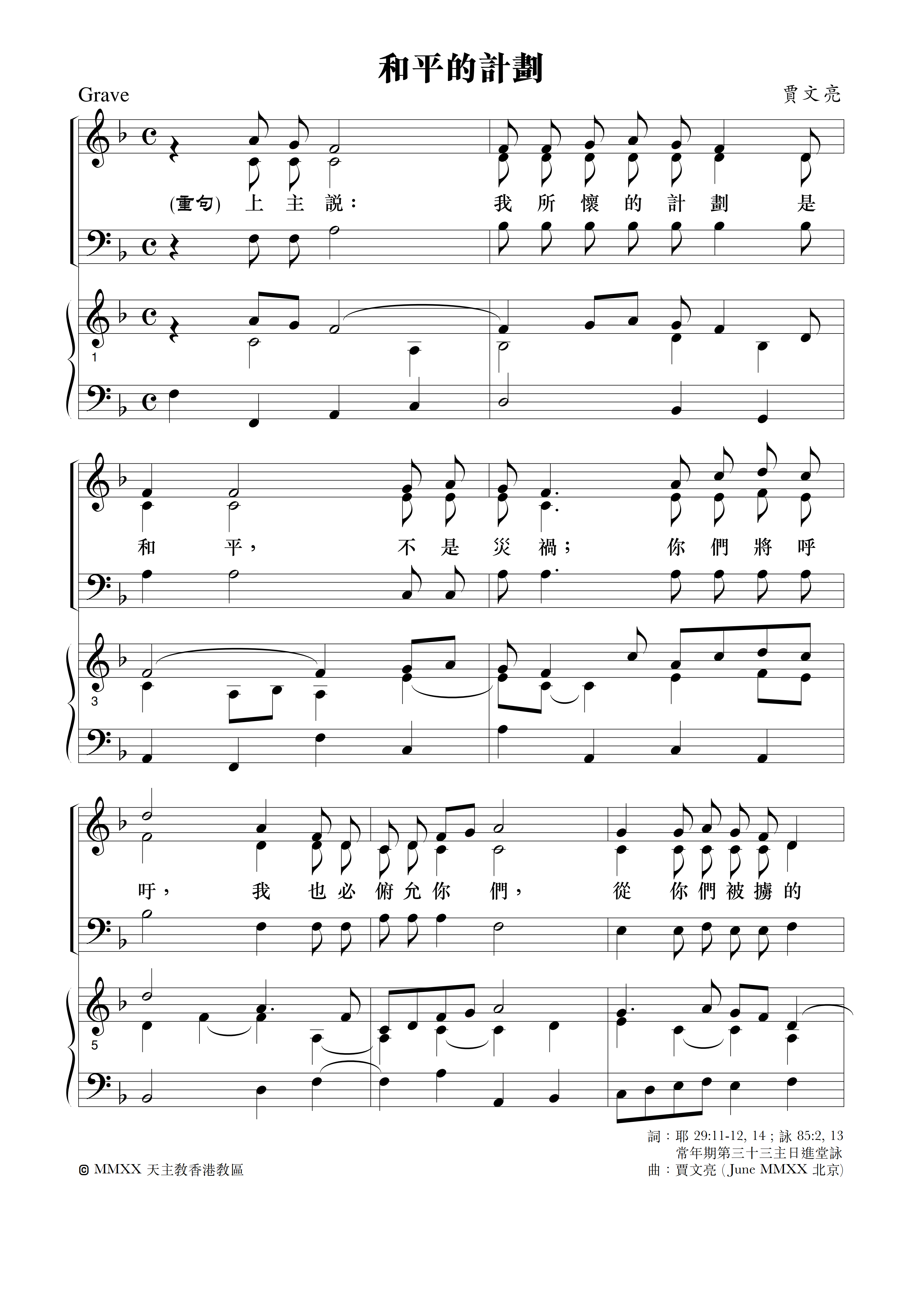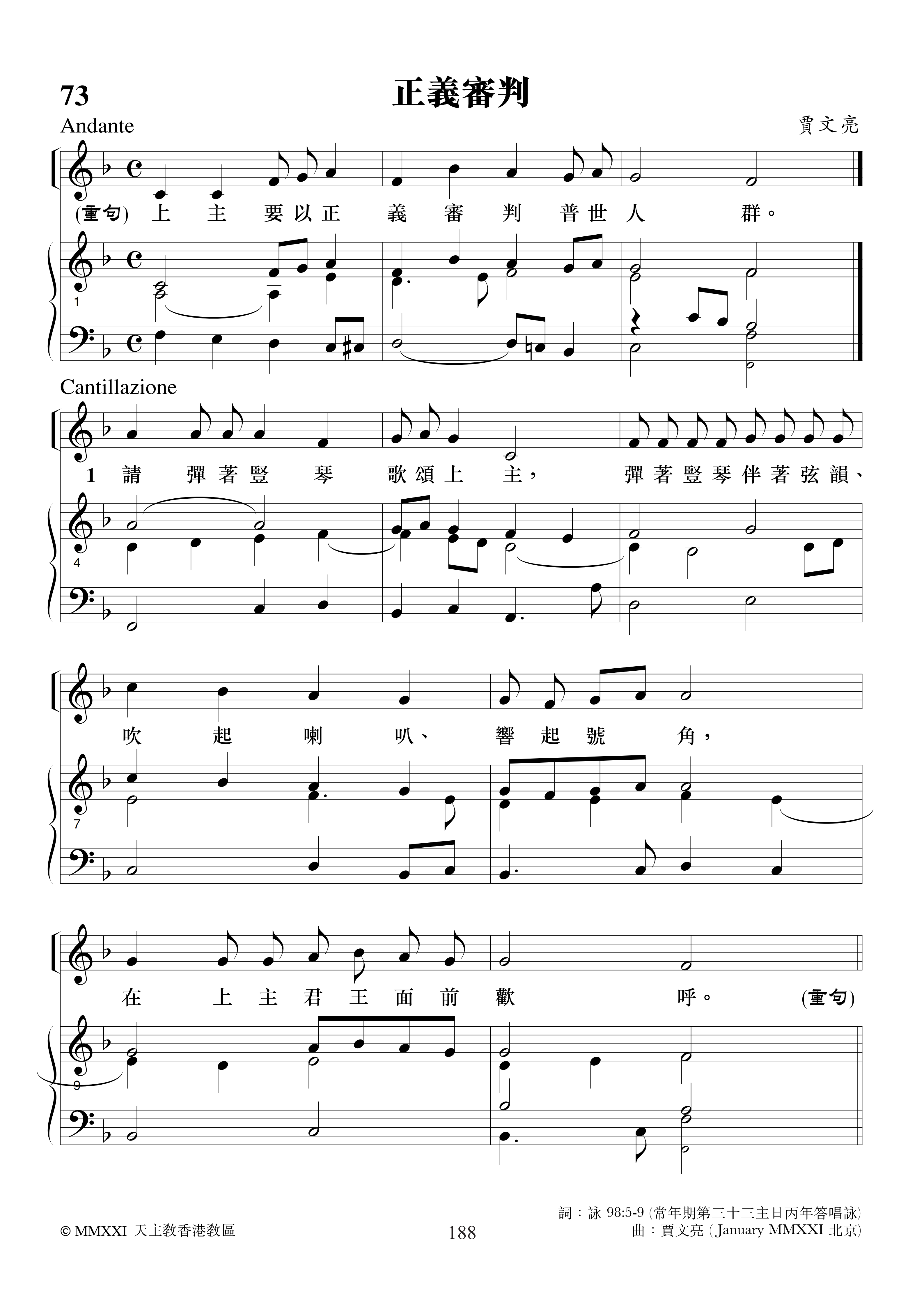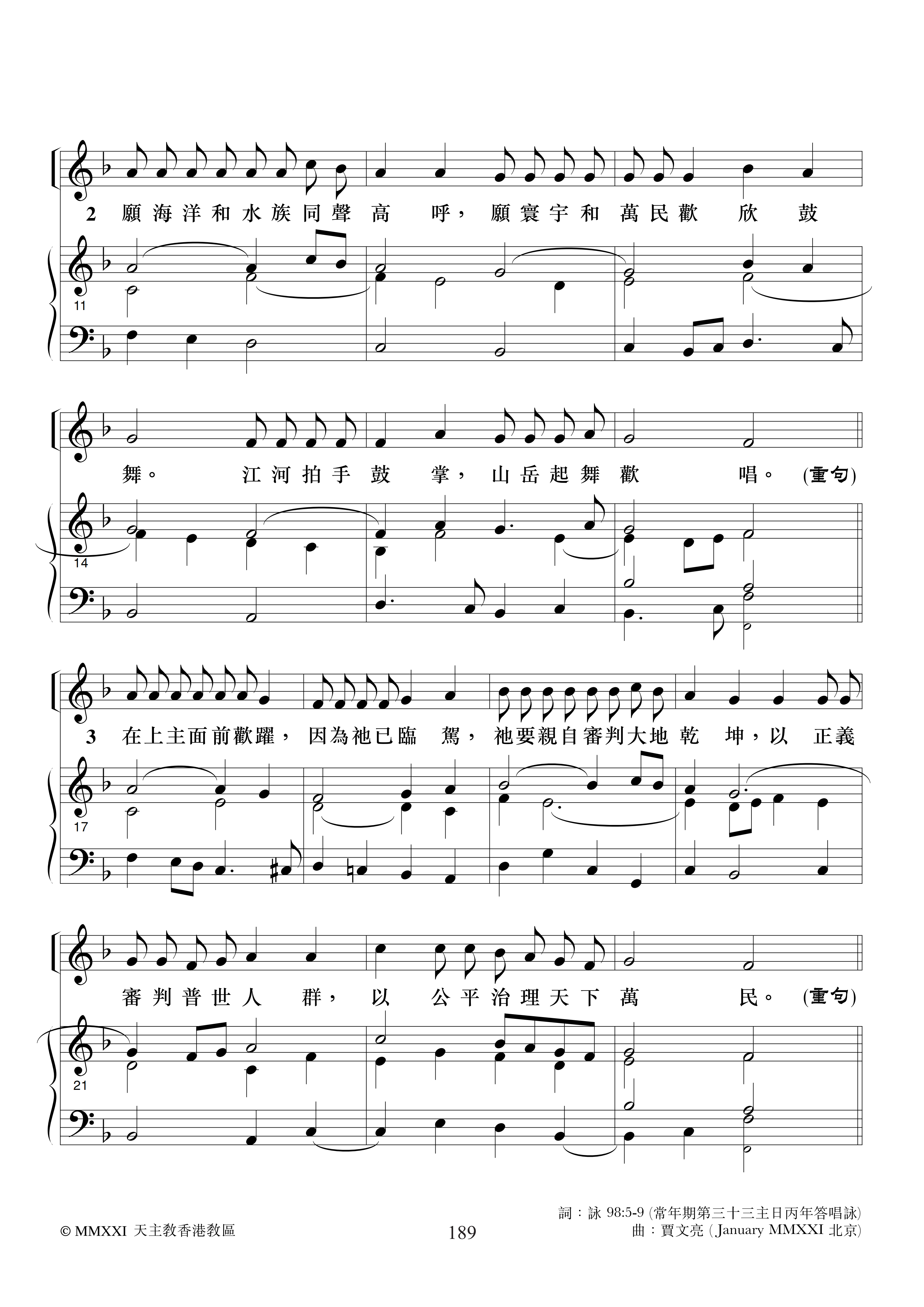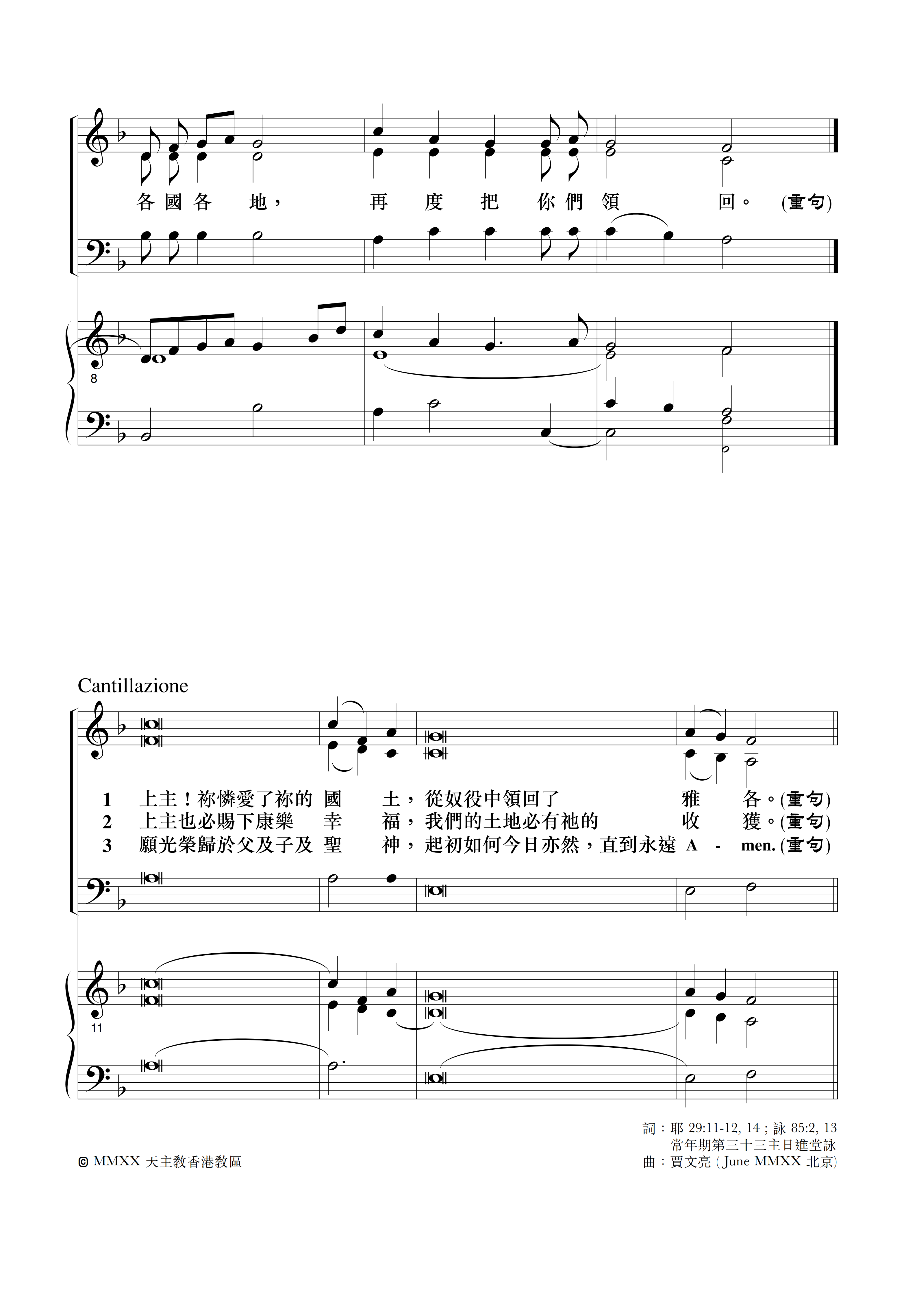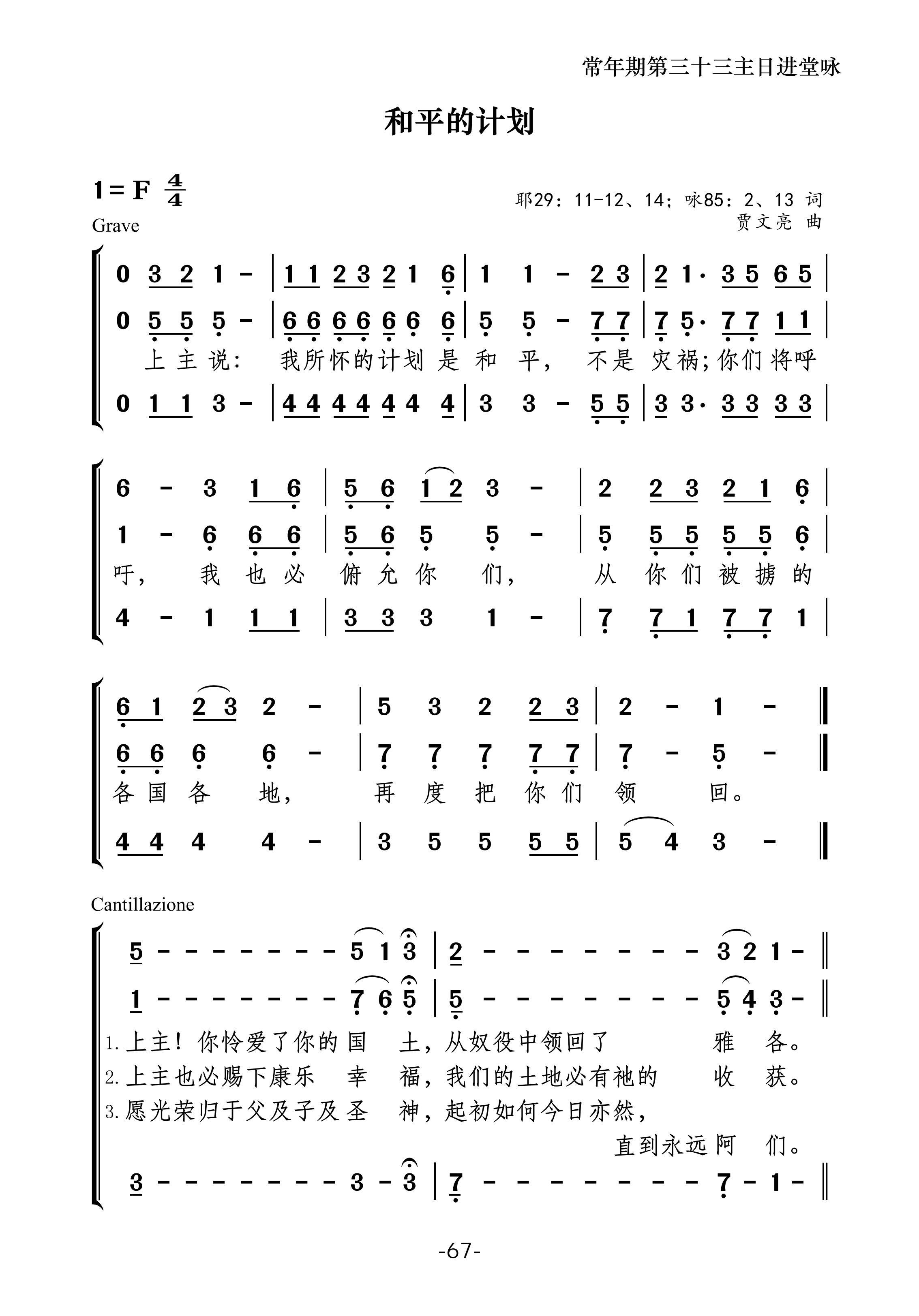 礼仪用曲 | 丙年常年期第三十三主日-贾文亮 发布日期:2025-11-11 | 作者:小驴驹工作室 ·进堂咏· 常年期第三十三主日进堂咏专辑:全年进堂咏作者:小驴驹工作室 常年期第三十三主日进堂咏-S专辑:全年进堂咏作者:小驴驹工作室 常年期第三十三主日进堂咏-A专辑:全年进堂咏作者:小驴驹工作室 常年期第三十三主日进堂咏-TB专辑:全年进堂咏作者:小驴驹工作室 ·答唱咏· 常年期第三十三主日丙年答唱咏专辑:答唱咏·丙年作者:小驴驹工作室 如您需要保存歌谱,请长按谱歌进行保存。