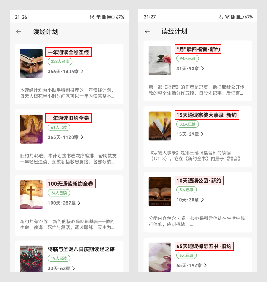 答:您好,新版本新增30+读经计划主题。包含整卷圣经、旧约整卷、新约整卷,以及圣经各板块(法律书,又‘梅瑟五书’、历史书、智慧书和先知书等),建议结合已读进度选择合适的读经计划,既延续之前的读经进度,又避免手动翻日期的麻烦。